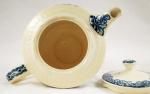 Boven in de rand van de theepot zit een haarscheurtje en de deksel heeft een flee bite