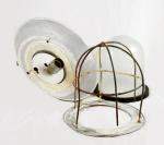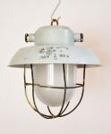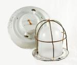 Industriële fabriekslamp met ondoorzichtige glazen bol, aluminium kap en ijzeren beschermrooster