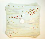 Vierkante lamp van glas met gestreepte en ronde decoratie in de kleuren geel en rood, op grijs- witte ondergrond