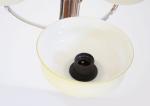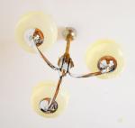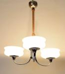 Drie-armige verchroomde kroonluchter met drie glazen schaalvormige kappen