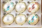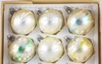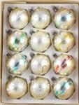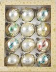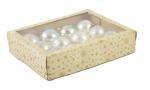 Twaalf zilverkleurige kerstballen met witte, rode, blauwe, gele en groene decoratie in originele doos
