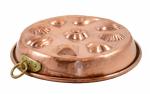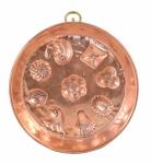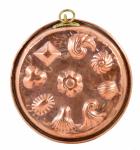 Koperen Franse ronde ovenschaal met verschillende koekjesvormen en messing ophang oog