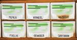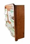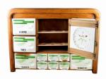 Vintage houten keuken kruidenkastje met aardewerk lades en eierkastje met fraai bewerkt aardewerk deurtje