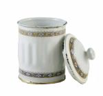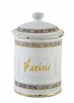Antieke Franse kleine voorraad bus Farine, wit emaille, met florale decoratie en goudkleurige biezen en letters