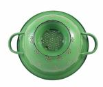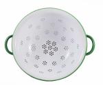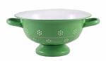 Vintage vergiet op voet, resedagroen emaille, met zilverkleurige biezen