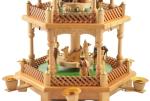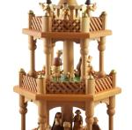 Vintage Duitse houten Erzgebirge kerstpiramide met vier verdiepingen waarop herders, schapen,kamelen, een ezel, de drie koningen, Maria en Jozef en het kerstkind staan