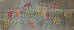 Kleuren: donkergrijs, rood, oranje, wit, donkergeel en groen